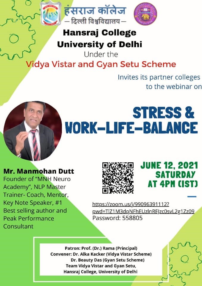 Registration of Participants: NA (Registration was not required)A webinar on “Stress and Work-Life-Balance” was organised on 12 June 2021 under the Vidya Vistar Scheme and Gyan Setu Scheme, Hansraj College. The speaker, Mr. Manmohan Dutt provided a detailed presentation on the meaning of stress. Our professional engagements and personal life issues may often lead to physical, emotional, or psychological strain.
