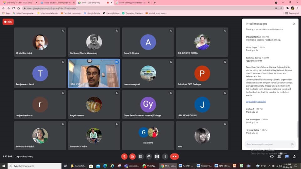 Registration of Participants: 202A One-day National Weinar was organised on 21 August 2021 by Hansraj College, University of Delhi in collaboration with Dergaon Kamal Dowerah College, Dibrugarh University under the Gyan Setu Scheme. The webinar laid emphasis on the theme: Literature of North-East: Its Status and 5 | Page Relevance in the Contemporary Indian Literary Context. The One-Day National Webinar attempted to bring to the forefront different perspectives of such writings from the contemporary Indian literary context in terms of North-East India, especially its status and relevance. The One-Day National Webinar not only made a case for examining literature with a pre-existing, pre-compiled traditional literary history but also examines them critically from the point of view of different perspectives keeping in mind the ethnicity of the place i.e. North-East India. The webinar provided a fresh academic exercise that will produce new insights into the study of literary texts from a diverse set of North-East India theoretical and analytical framework.