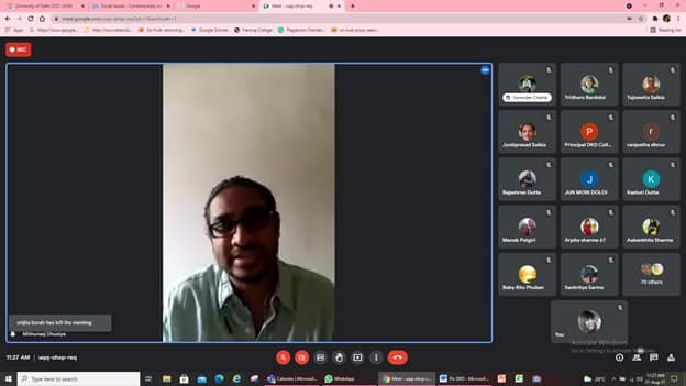 The webinar started with the keynote address by Dr. Mithuraaj Dhusiya. The keynote address was followed by two sessions by eminent speakers Professor Bibhash Choudhury and Dr. Mridul Bordoloi. The valedictory address was given by Dr. Ranjit Kumar Bordoloi, Principal of Dergaon Kamal Dowerah College, Dibrugarh University.