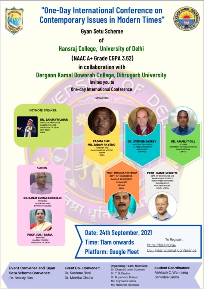 Registration of participants: 295Hansraj College (NAAC A+ Grade), University of Delhi invites you for a One-Day International Conference on Contemporary Issues in Modern Times, organised under the Gyan Setu Scheme in collaboration with Dergaon Kamal Dowerah (DKD) College.