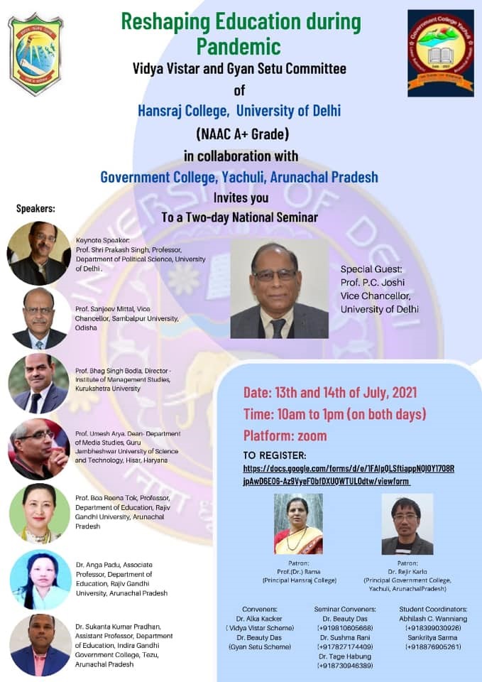 Registration of Participants: 416A two-day National Seminar was organised from 13 July 2021 to 14 July 2021 by Hansraj College, University of Delhi in collaboration with Government College, Yachuli, Arunachal Pradesh under the Vidya Vistar Scheme and Gyan Setu Scheme. The seminar dealt with the theme — Reshaping Education during Pandemic. The outbreak of the COVID-19 pandemic posed a major challenge for the teaching-learning process. The pandemic proved to be a major obstacle for assessment and evaluation. Along with the technical issues which impaired the flow of education, the human tragedy of the impending crisis impacted all. During the course of the two-day National Seminar, a panel of eminent academics from different parts of India addressed some of these critical issues.