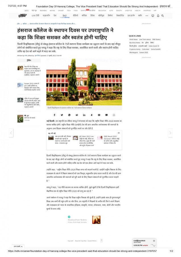 The Delhi University’s (DU) Hansraj College has secured the third position in the National Institutional Ranking Framework (NIRF) 2025 ranking for colleges, recording its best-ever performance after a jump o......
