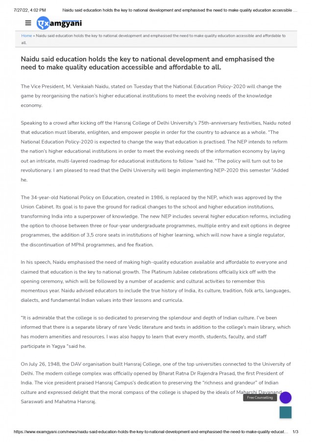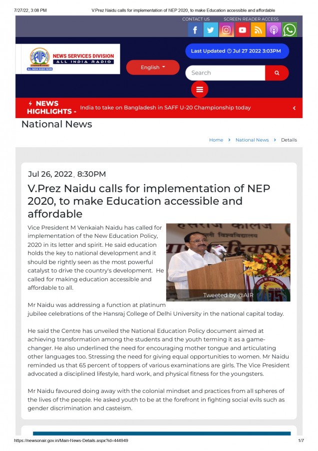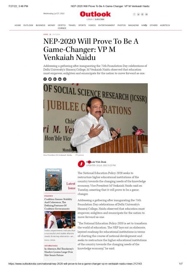 The Delhi University’s (DU) Hansraj College has secured the third position in the National Institutional Ranking Framework (NIRF) 2025 ranking for colleges, recording its best-ever performance after a jump of nine spots from last year.