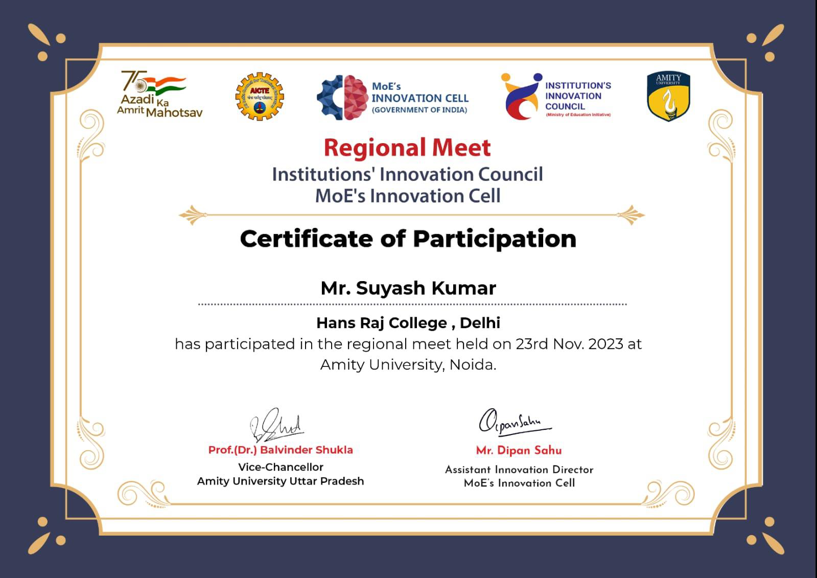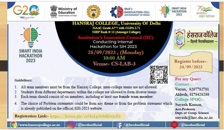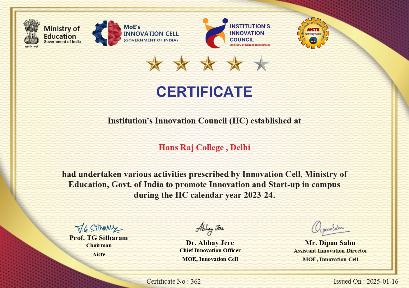 NAAC Grade A++ with CGPA 3.71 NIRF Rank # 3 (Amongst Colleges)The innovation council has been established by Ministry of Human Resource Development (MHRD), Govt. of India to inculcate a tradition of research through innovation amongst all Higher Education Institutions (HEIs). Hansraj College has been a proud recipient of establishing an Innovation Council in the College under the IIC scheme of MHRD. The primary focus of the innovation cell is to provide support to the young minds for the new ideas and innovations in research.