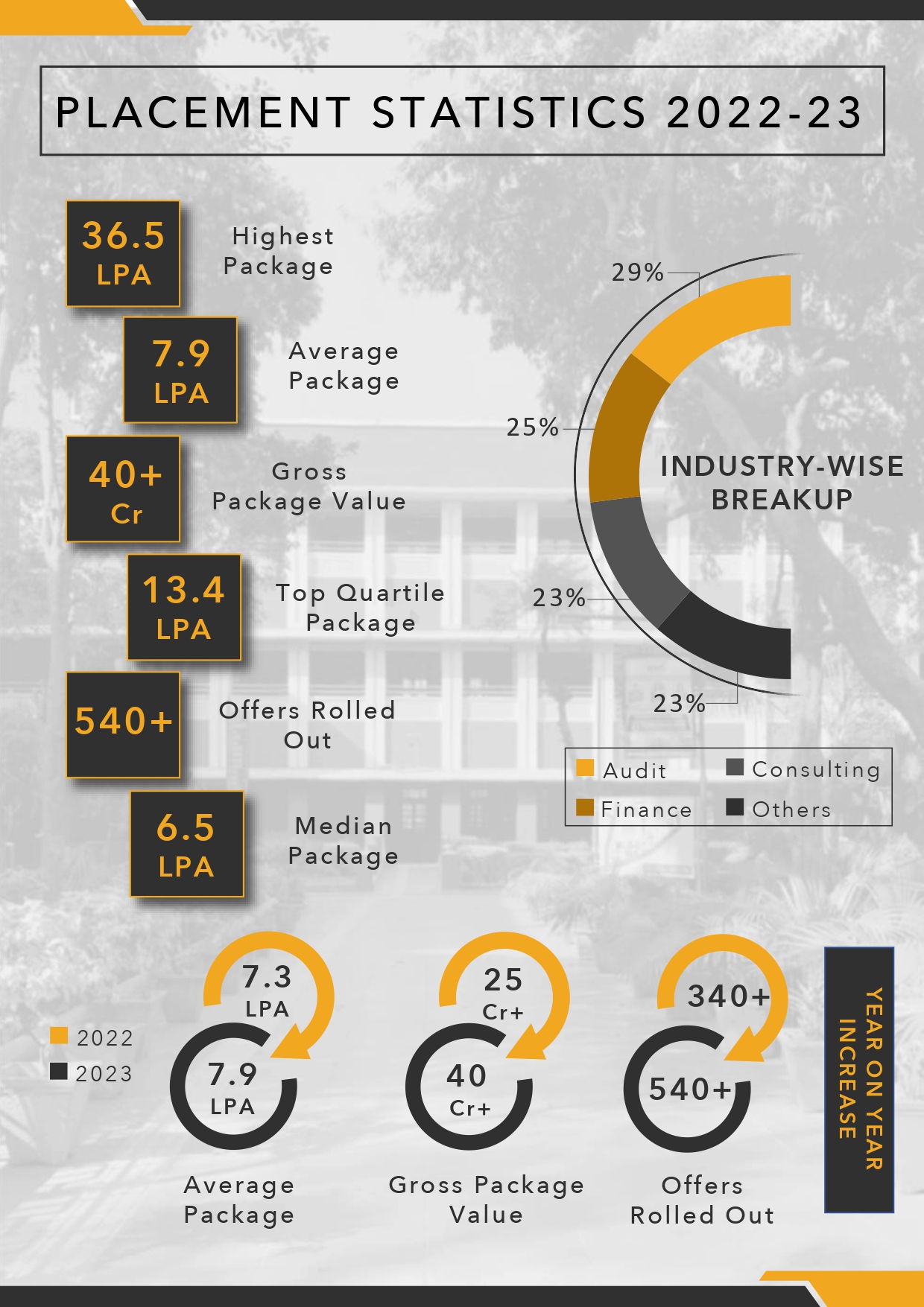 The college has been a host to prominent recruiters like McKinsey & Co., Bain & Co., Boston Consulting Group, Accenture Strategy, ZS Associates United Airlines, DE Shaw, Deloitte, EY, KPMG, PwC and has attracted recruiters operating in varied industries like Consulting, Investment Banking, Finance, FMCG, Pharmaceuticals, etc.