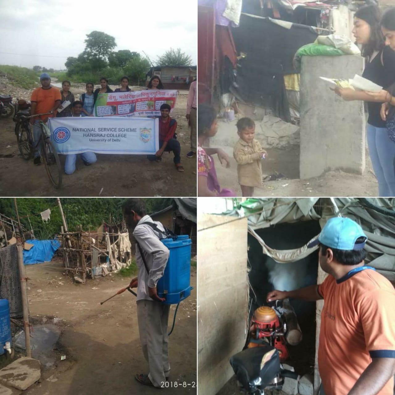 N.S.S. Hansraj took up the task of fumigating the Yamuna Khadar Slum. The slum, adopted by N.S.S. Hansraj, is located on the banks of the river Yamuna, and has always been under the incessant threat of diseases like Malaria and Dengue. The drive was undertaken by Mr. Dharmendra from EAST DMC, under whose guidance, a door to door awareness campaign was organised where residents of the slum were made cognizant of the measures that can prevent the spread of such fatal diseases, the importance of adequate hygiene and the dangers that clogged water brings with itself. All homes and pits containing stagnant water were treated. N.S.S. Hansraj acknowledges the efforts of all those present for the drive and thanks them immensely.