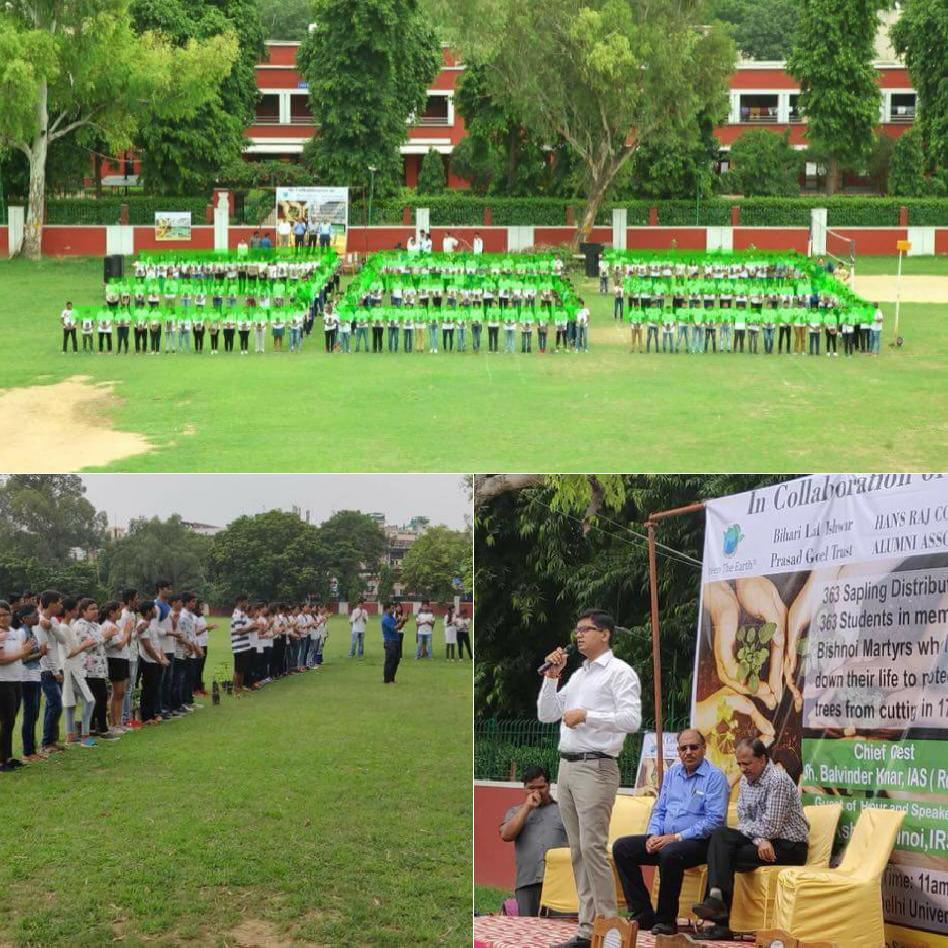 'Jeev Daya Palani' {Be compassionate to all living beings} - Guru Jambeshwar Ji (Founder of The Bishnoi Faith) Celebrating this very spirit, NSS Hansraj organised a Plant Sapling Donation Drive in collaboration with Hansraj Alumni Association and the organisation, Green the Earth, honouring those 363 passionate Bishnoi villagers who sacrificed their lives to protect their environment. The event was attended by the dedicated volunteers of NSS, NCC and Haritima alike. The event began with the address of Shri Ashok Bishnoi, an IFS officer and a member of Bishnoi Community, who highlighted the contribution of Bishnoi community in saving and nurturing the environment for centuries. During the programme, Mr. Balvinder Kumar, retired IAS officer and chief guest for the event, appealed to people for protecting the forest and wildlife in his keynote address. Shri Mahendra Goel, President of Hansraj Alumni Student Association, also inspired volunteers to do their own bit to save the environment and to inspire others in bringing the change. After the inspiring words of guests, the volunteers from the NSS Hansraj formed the pattern '3 6 3' holding the plant sapling in their hands, giving a clear and loud message of the need to save the environment. The event stood as a symbolic metaphor for an undying spirit to preserve the environment for our future generations.