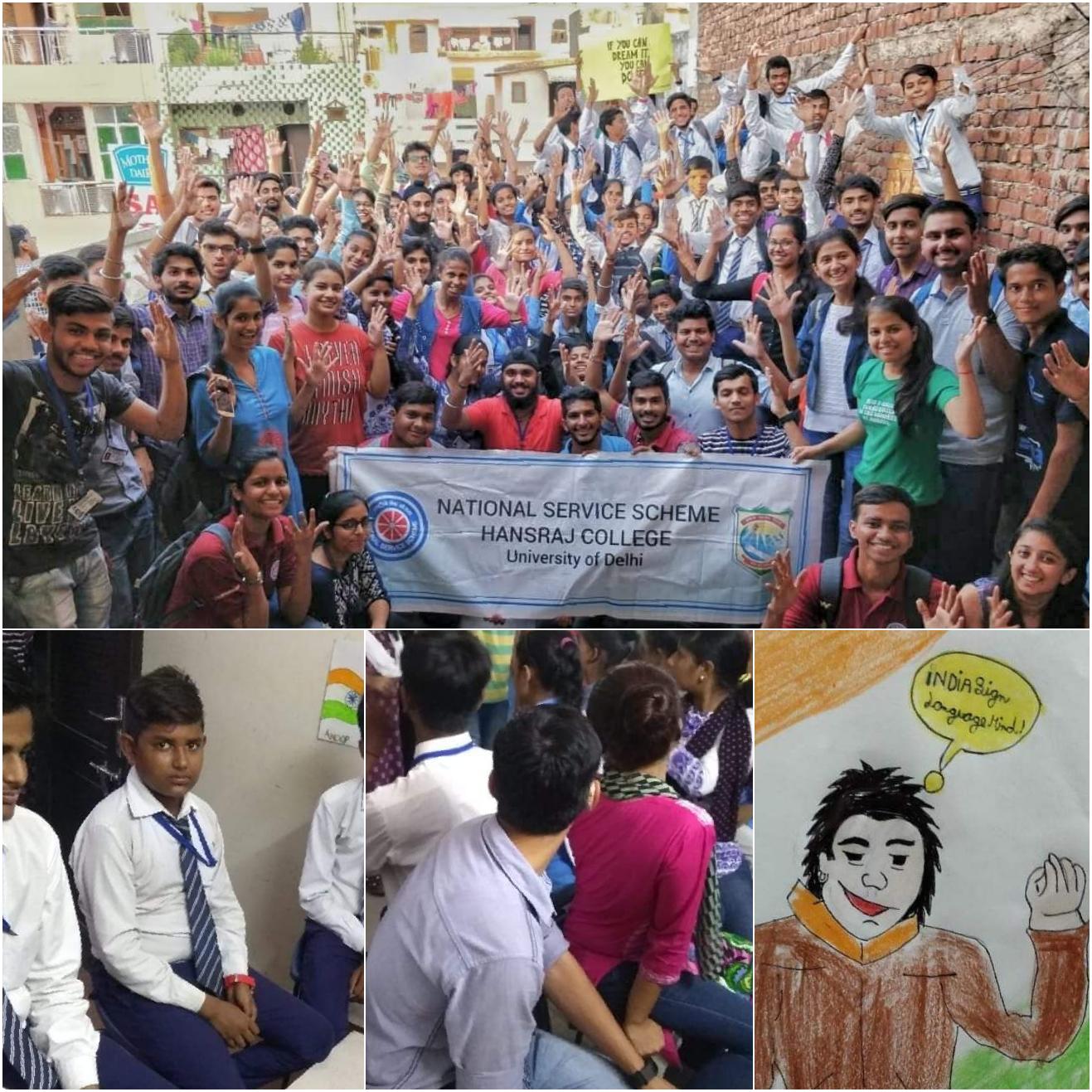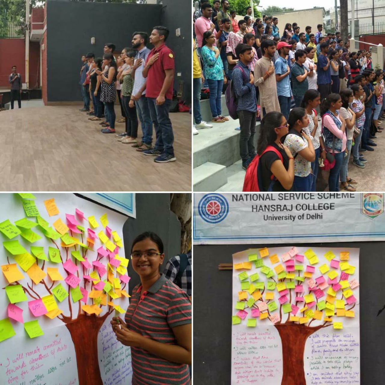 Carrying forward the legacy of 'Swachhta Pakhwada', a fortnight celebration to increase awareness about cleanliness, NSS Hansraj organised a pledge taking ceremony. The pledge, also known as the 'Swachhta Shapath', was recited by a vast multitude of volunteers who promised to take a step towards maintaining cleanliness in our surroundings. NSS also made sure to tap into its creative side, and made the volunteers sign a petition where they shared their views about increasing the awareness about hygiene and sanitation in unique and creative ways. The event was truly a commemoration of our heartfelt spirit of realising the importance of hygiene and sanitation in our day to day lives, and garnered praise from all the beneficiaries. We thank all the volunteers for their enthusiastic participation.