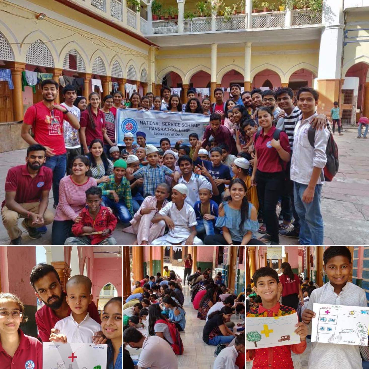 To mark the culmination of the 'Joy Of Giving' week, Team NSS Hansraj visited 'Bachchon Ka Ghar', an orphanage in Daryaganj. Beginning with an interactive session with the children, we organized a drawing activity for these innocent minds, the theme for which was the ambition of the children. The volunteers also helped the members of the orphanage in serving food. Having relished the food, the children joined the team of volunteers in playing 'Jump In, Jump Out', a game that made the little ones roar with laughter. Team NSS also donated rice and bedsheets to the underprivileged. It is with immense sincerity and pleasure, that we thank the staff at 'Bachchon Ka Ghar' for their cooperation and, the volunteers for being so sensitive to the needs of others and investing their time and effort.