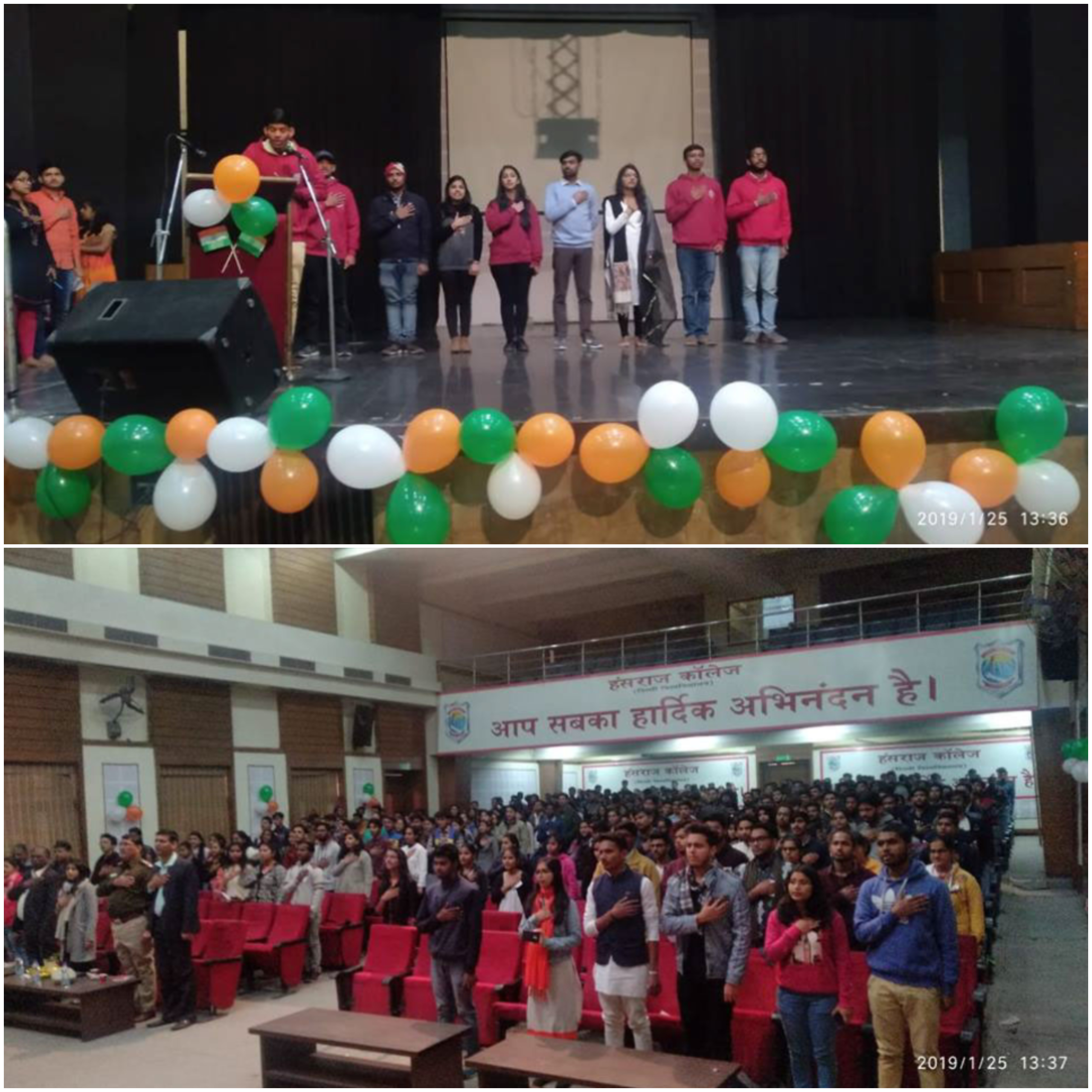 NSS Hansraj organised a voting pledge ceremony to commemorate the National Voters' Day, and to sensitise people about the immense power that their vote carries. The event saw students and staff from myriad backgrounds coming together in a sense of community, to pledge to excercise their vote in a judicious manner. The event was graced by the graceful persona of our Principal, Dr. Rama and Mr. Ram Avatar Tyagi, the S.H.O. of Maurice Nagar Police Station, along with Sh. Priyadarshini, the Manager of Canara Bank, Hansraj College. The event did go a long way to sensitise people about their electoral power, and inspired them to make change by voting. We would like to extend our heartfelt gratitude to all guests of honour for taking time out from their schedules, and our volunteers for their help and support!