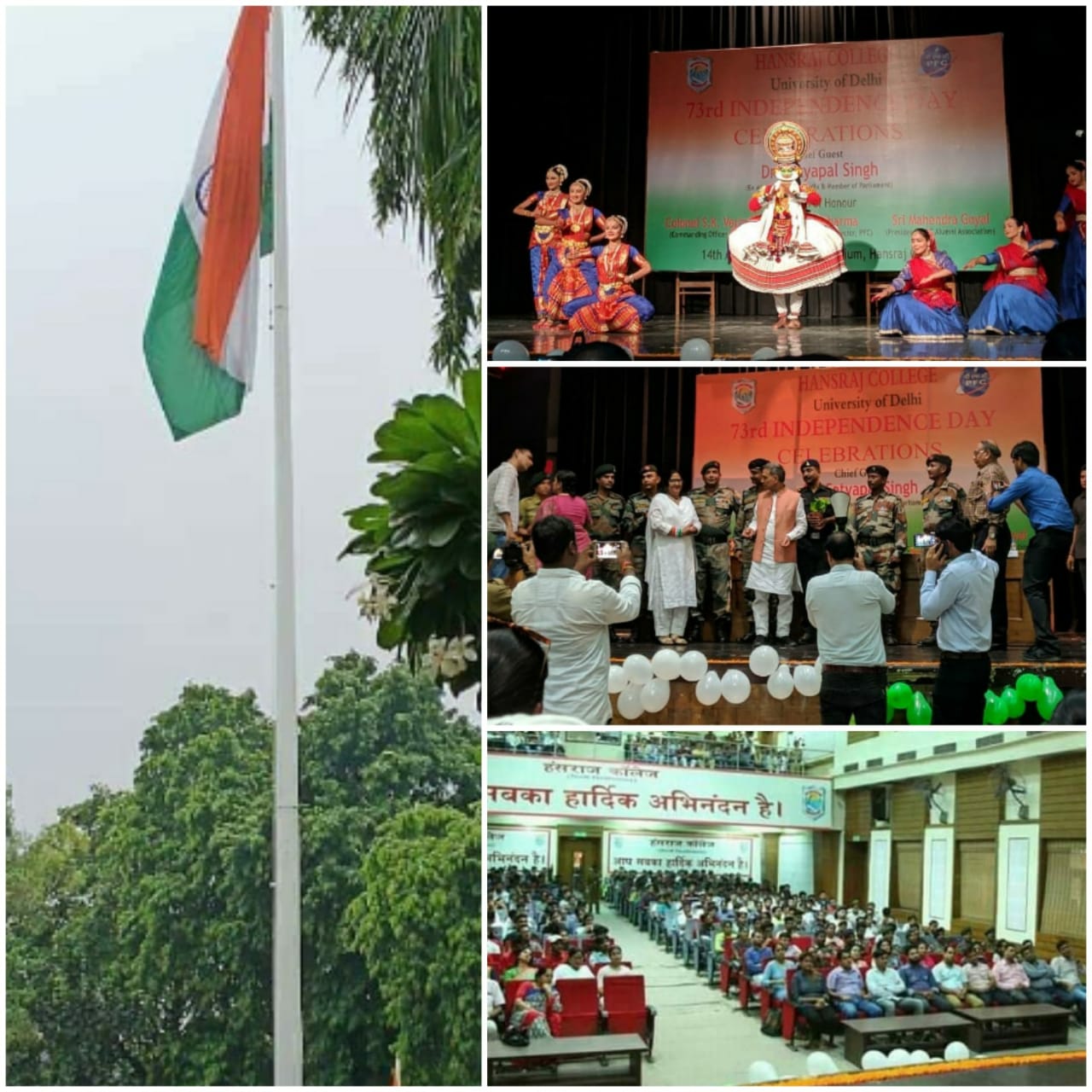 On the 73rd Independence Day of our beautiful nation India, a day when every Indian is brimming with patriotism and when the tricolour becomes the colour of the sky, we at N.S.S. Hansraj got the opportunity to organise an event in the college campus to celebrate this auspicious day. The event commenced with a flag hoisting ceremony at 10:30 a.m. and as the glorious tricolour ascended the sky, the heads of the onlookers bowed down as a mark of respect for the nation. Dr. Satpal Singh, ex Minister in the Government of India, was the chief guest. Other imminent personalities who graced the event with their presence were Col. S. K. Verma, Shri Rajiv Sharma and Shri Mahendra Goyal. The flag hoisting was followed by cultural presentations in the College Auditorium wherein the N.C.C. cadets performed a beautiful skit, members of Swaranjali sang an elating patriotic song and the members of Oorja delivered impactful dance performances. The ceremony concluded at 12:30 p.m. as our honourable Principal Dr. Rama felicitated the P.I. staff and Col. S. K. Verma. The event was overall a gratifying experience for all the spectators. We are grateful to be provided the chance to organise the event and hope to continue with the same enthusiastic spirit in future.