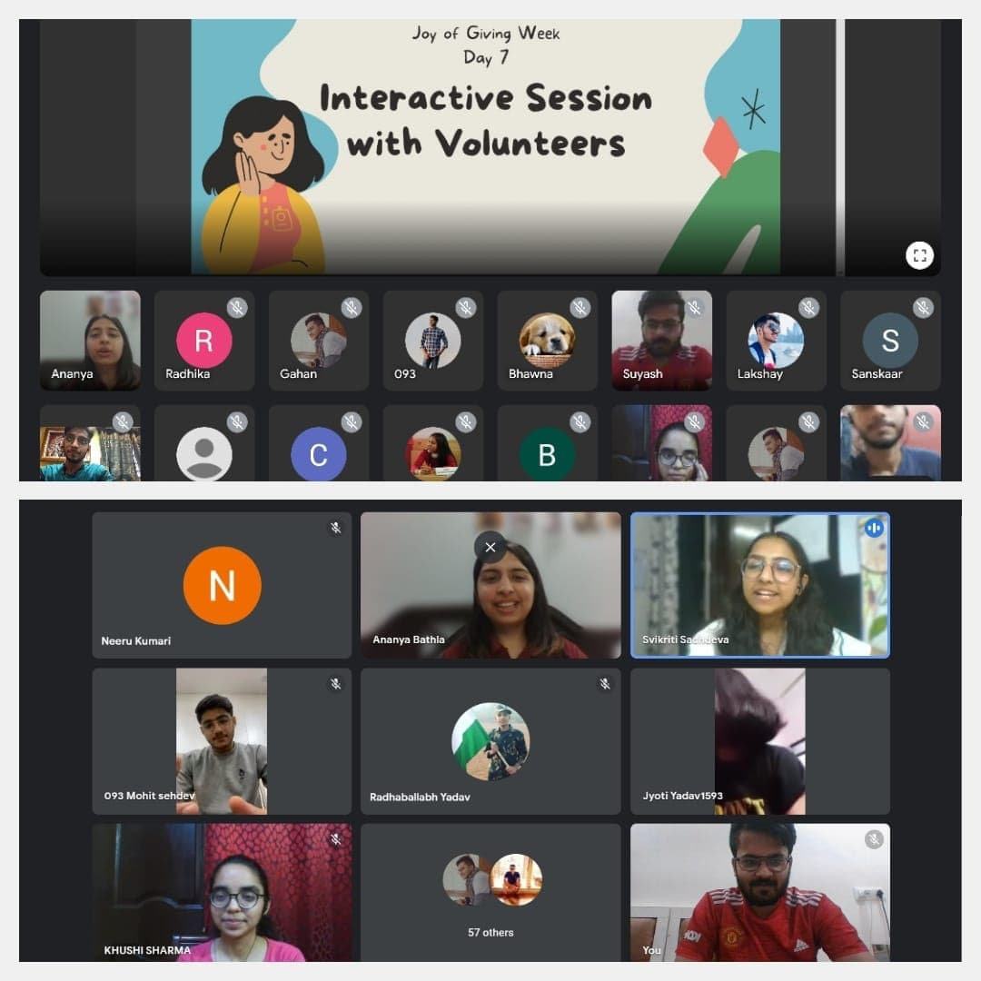 NSS Hansraj conducted an interactive session on the last day of ‘Joy of Giving Week 2021’ on 10th October. Our core members, coordinators, and volunteers whimsically participated in fun activities and games entailing 'Fastest finger first', 'Guess the advertisement tag line', 'Sell a product' alongside jamming on songs and a team building session of story formation game. These enhanced the involvement of the volunteers and boosted their soft skills too. The alacrity with which our team interacted mesmerized everyone and ended the week on a positive and successful note. Prioritizing the holistic development and mutual upliftment of our team, we ensure to keep organizing such amazing events in the future.