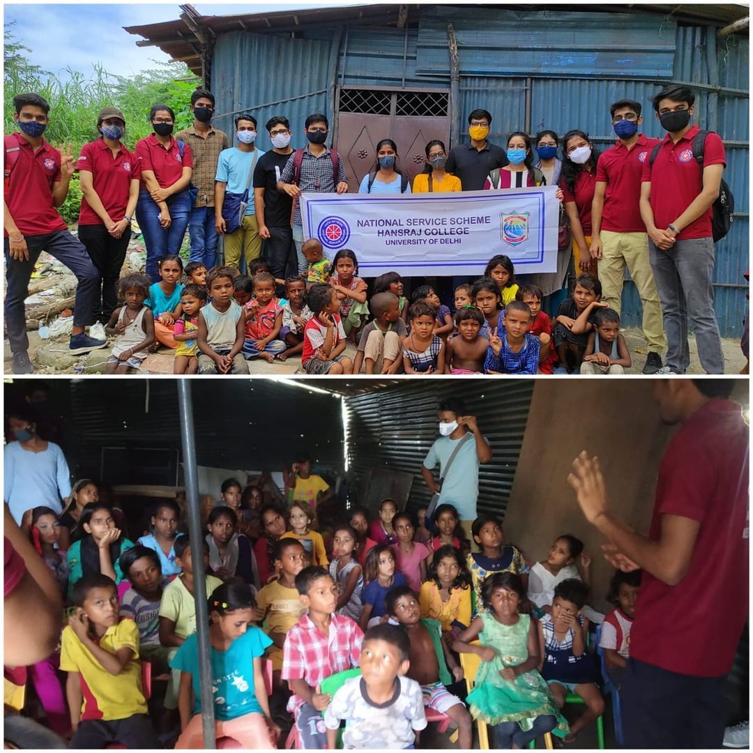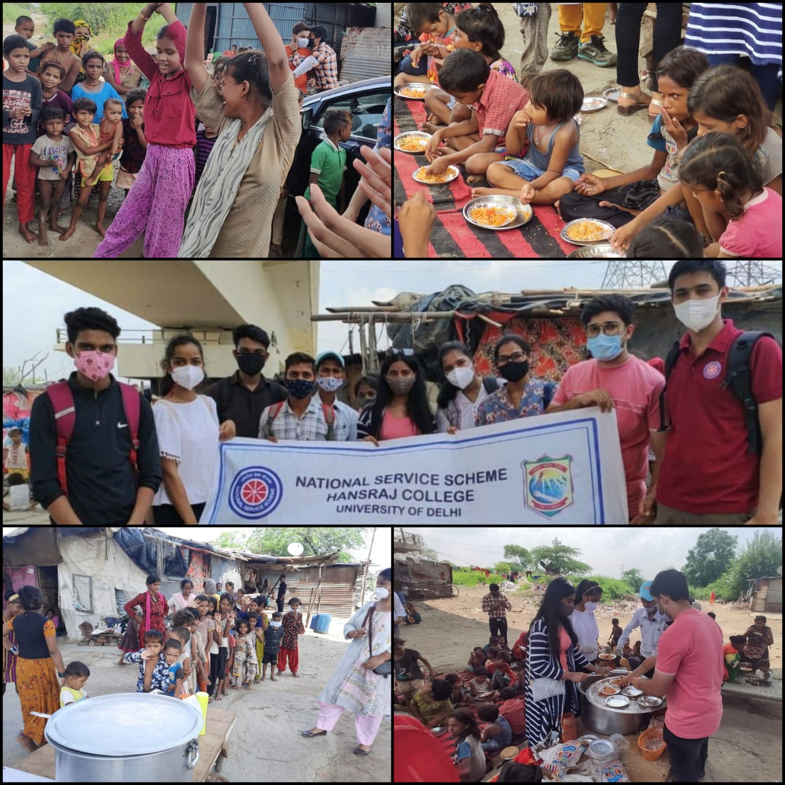 The ongoing pandemic has had horrendous consequences. Whole of the world is suffering. However, the ‘have nots’ are the worst hit. Hunger and uncertainty have clutched the deprived section, rendering them hopeless. With the objective of putting a smile on these grim faces and commemorating the completion of 4 years of Project Parvarish, we at NSS Hansraj organised a Food Donation Drive at Yamuna Khadar on 24th July, 2021. Our volunteers assembled near about 150 residents and offered them food. The residents were also encouraged to sing and dance and play games. It felt wonderful to see them enjoy, oblivious of worries.