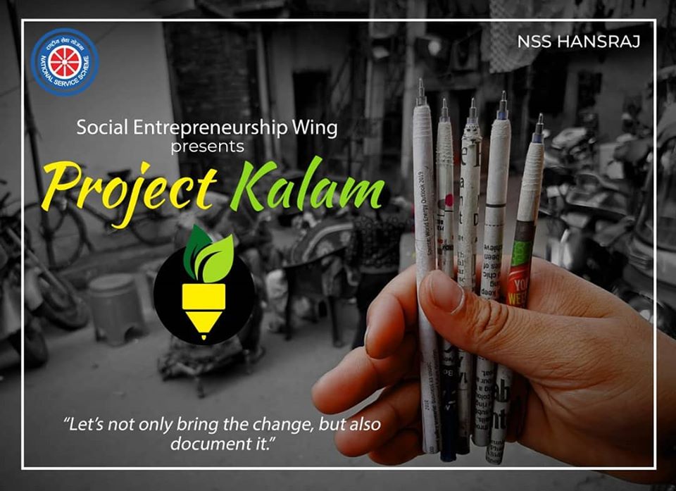 Kind eyes get hurt and kind hearts pain when they see the condition of the unfortunate. Out of that pain, arises a willingness to help those in need. With the initiation of Project Kalam, NSS Hansraj attempts to pour happiness within the society's framework. This project of the Social Entrepreneurship Wing targets the two biggest evils of society - Poverty and Pollution. It aims to employ underprivileged women. They make eco-friendly pens, from old newspapers, which contain seeds. After usage, the pen can be buried in soil to give birth to a beautiful plant. The newspaper, on decomposing, shall become manure for the soil. The women, thereby, earn their living on their own, and the environment is saved from the harmful plastic of ordinary pens. Project Kalam is a further addition to the list of already flourishing projects of NSS Hansraj that are helping us fight social evils of the society.
