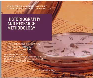 The Department of History in collaboration with Mahatma Hansraj Faculty Development Centre (MHFDC) organized one-week online Faculty Development Programme on ‘Historiography and Research Methodology’ from 19-24 April 2021.