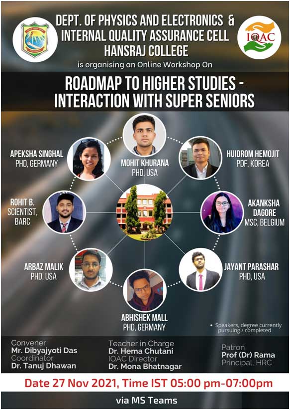 Many students during their graduation in Hans Raj College are curious about Higher Studies, and are in the process of figuring out their career path. We invited alumni of our Dept. of Physics & Electronics who are pursuing research in India and abroad to come and interact with our current students. This event gave exposure to our students regarding various career opportunities. The speakers gave presentations that included actionable advice to pursue higher studies and research abroad, advice regarding various problems and solutions that they faced as students, a summary of the kind of work that they are pursuing currently, and most importantly inspiration and exposure to our current students to the kind of cutting-edge research that is happening all across the world. The event was a success as students participated in large numbers, asking our speakers various questions, and engaging them. The entire event was recorded and has been uploaded to YouTube: https://youtu.be/ICO4pdlIptk