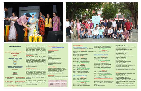 A National Conference on “Advanced Materials: Theory and Applications” (NCAMTA-2019) was organised by the Department of the Physics and Electronics, in the Conference room of Hans Raj College, from September 26-28th 2019. It was sponsored by UGC, CSIR and Hansraj College. This conference served as a platform for robust discussions on recent advancements and new strategies for development of new materials suitable for applications. The topics covered in the conference were,