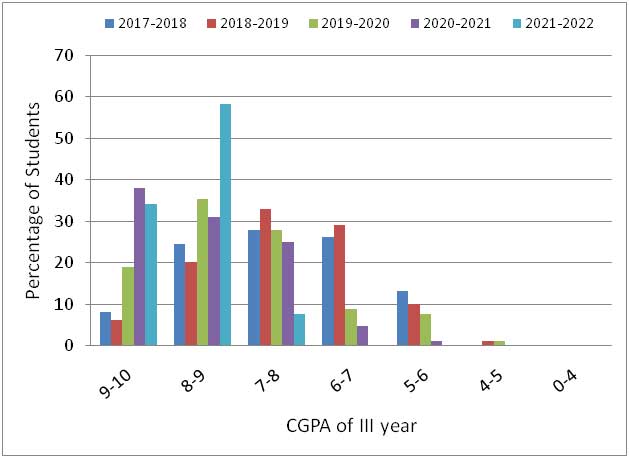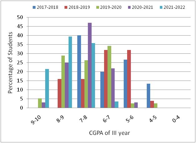 As depicted in the graph below the result of the department has shown continuous improvement with larger percentages falling in the higher CGPA bands.
