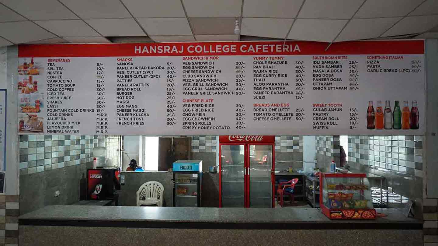 NAAC Grade A++ with CGPA 3.71 NIRF Rank # 3 (Amongst Colleges)The college has a well-furnished canteen that spreads over 375 metres, accommodating around 200 people. Having a wide variety of menu at highly nominal prices without any compromises on the quality of the food, the canteen provides a bustling ambience for the students, staff members and visitors with its spacious, hygienic and cozy space. A new venture called ‘Shakes and More’ is also instituted on the campus to offer an extensive variety of food and beverages. The canteen is efficiently administered by a Canteen Committee appointed by the College Staff Council who ensure to make it one of the finest and hygienic canteens in the University.