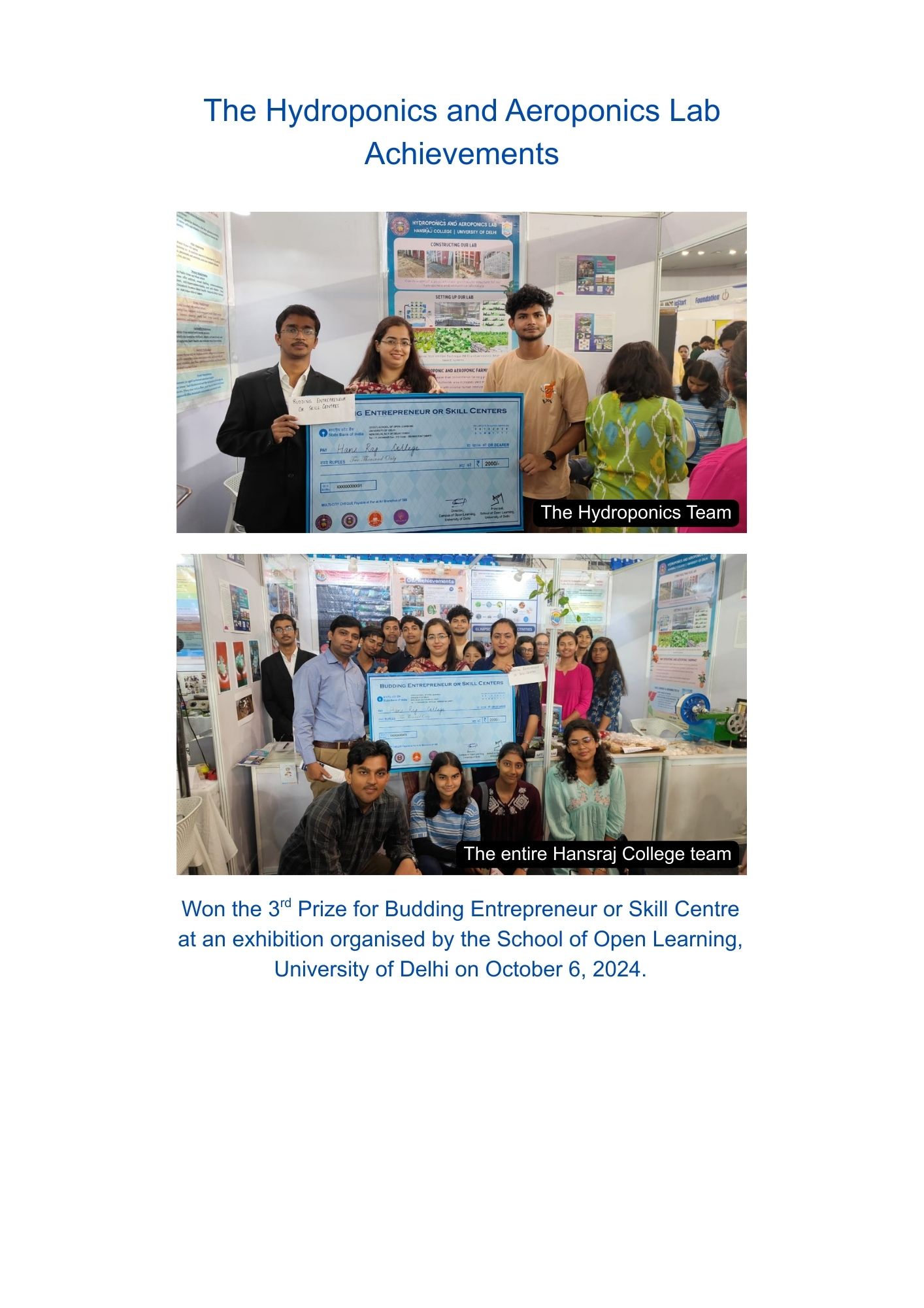 The Hydroponics and Aeroponics Lab has been established as a Skill Enhancement Centre in the Department of Botany, Hansraj College. The lab aims to train students in soilless farming practices. The Centre was funded by a special in-house grant for setting up a Skill Enhancement Centre to equip its students with a skillset for potential entrepreneurial possibilities and avenues. The centre follows a practical training approach with our undergraduate students to train them for setting up their own self-sustaining entrepreneurial farming ventures along with educating them about modern and sustainable farming practices. The lab provides active student engagement for setting up and managing the crops and equipment’s and thereby a complete hands-on experience in soilless farming. The Centre is also an integral part of a Skill Enhancement Course (SEC) on Hydroponic and Aeroponic Farming offered as per the NEP-UGCF 2020 in the college.