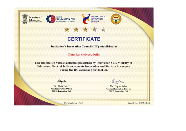 NAAC Grade A++ with CGPA 3.71 NIRF Rank # 3 (Amongst Colleges)The innovation council has been established by Ministry of Human Resource Development (MHRD), Govt. of India to inculcate a tradition of research through innovation amongst all Higher Education Institutions (HEIs). Hansraj College has been a proud recipient of establishing an Innovation Council in the College under the IIC scheme of MHRD. The primary focus of the innovation cell is to provide support to the young minds for the new ideas and innovations in research.