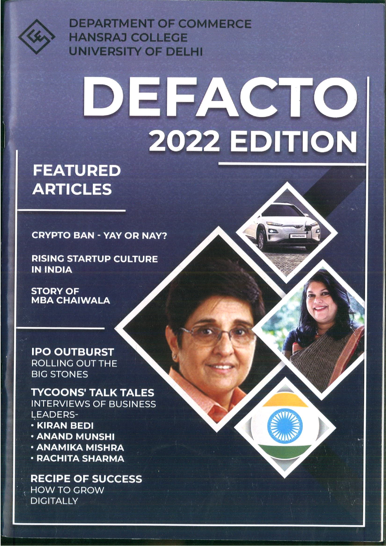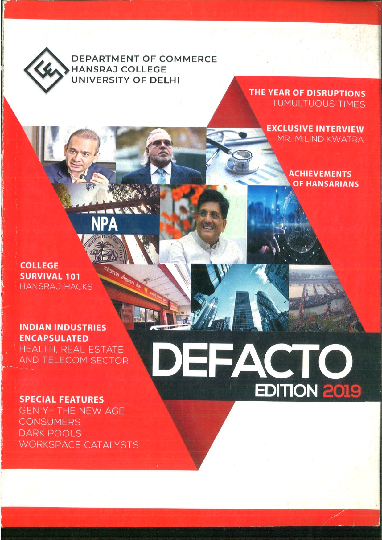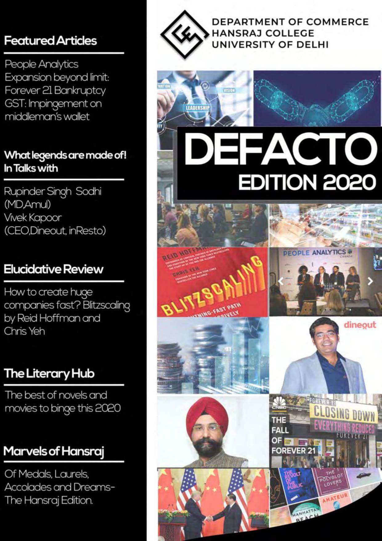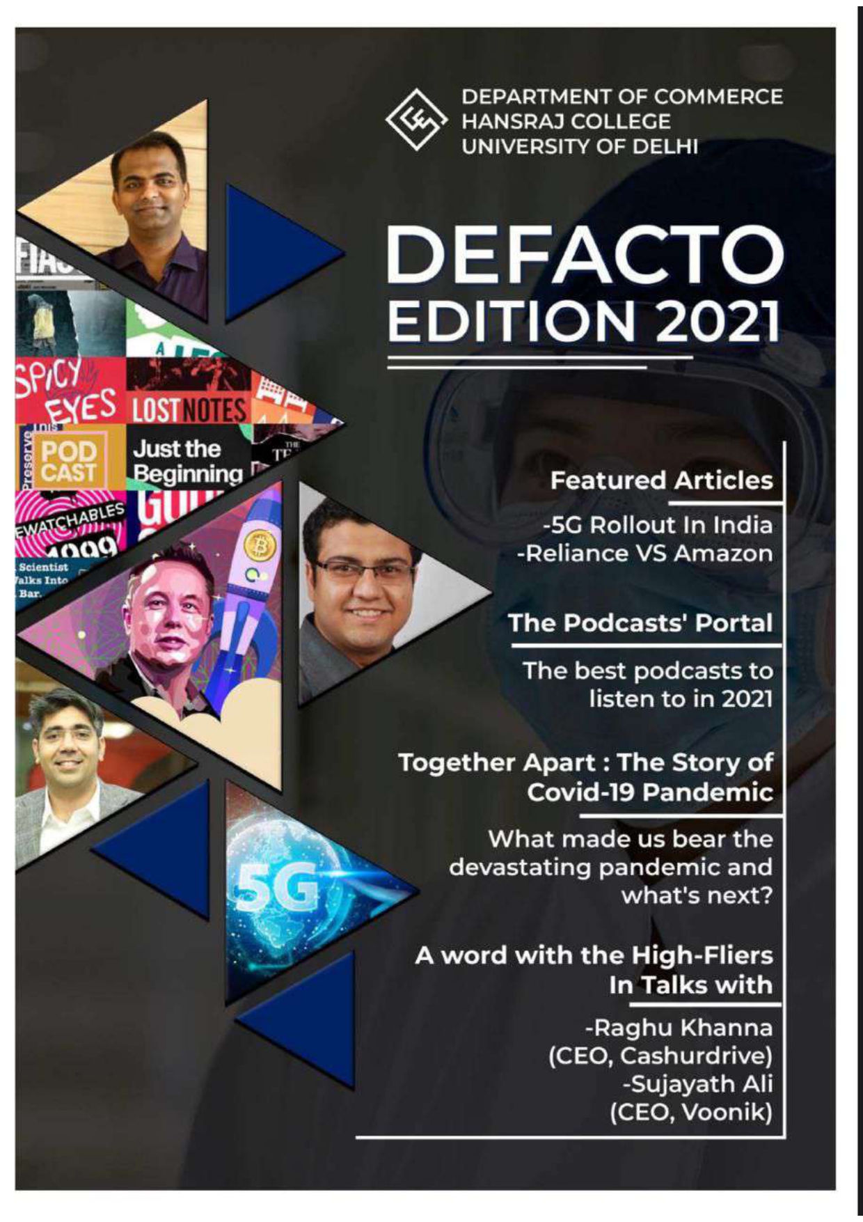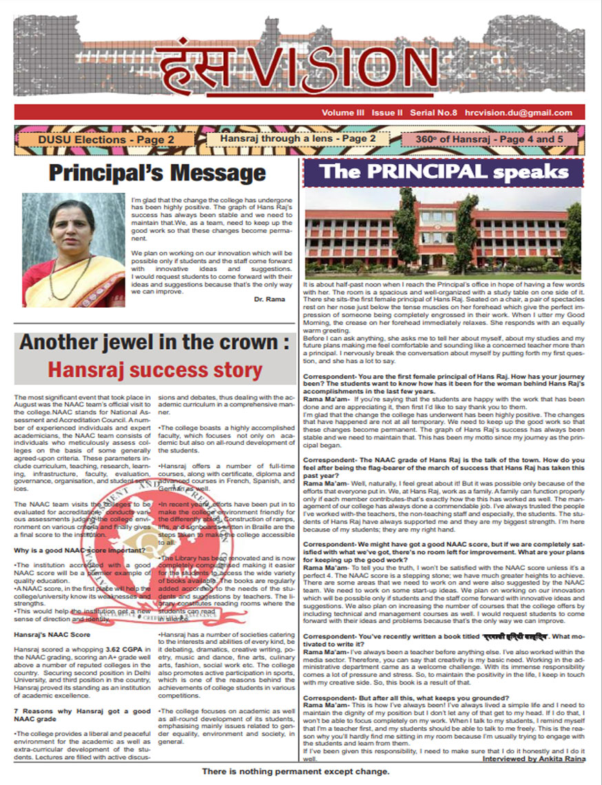 NAAC Grade A++ with CGPA 3.71 NIRF Rank # 3 (Amongst Colleges)Hans, the college magazine, has served as a platform for the students, faculty and staff of Hansraj College to showcase their immense literary talent and express their thoughts, feelings and insights about their perspectives on the world. It has provided a workbench to students, faculty staff to interconnect with each other beyond the confines of the classroom and regular curriculum.