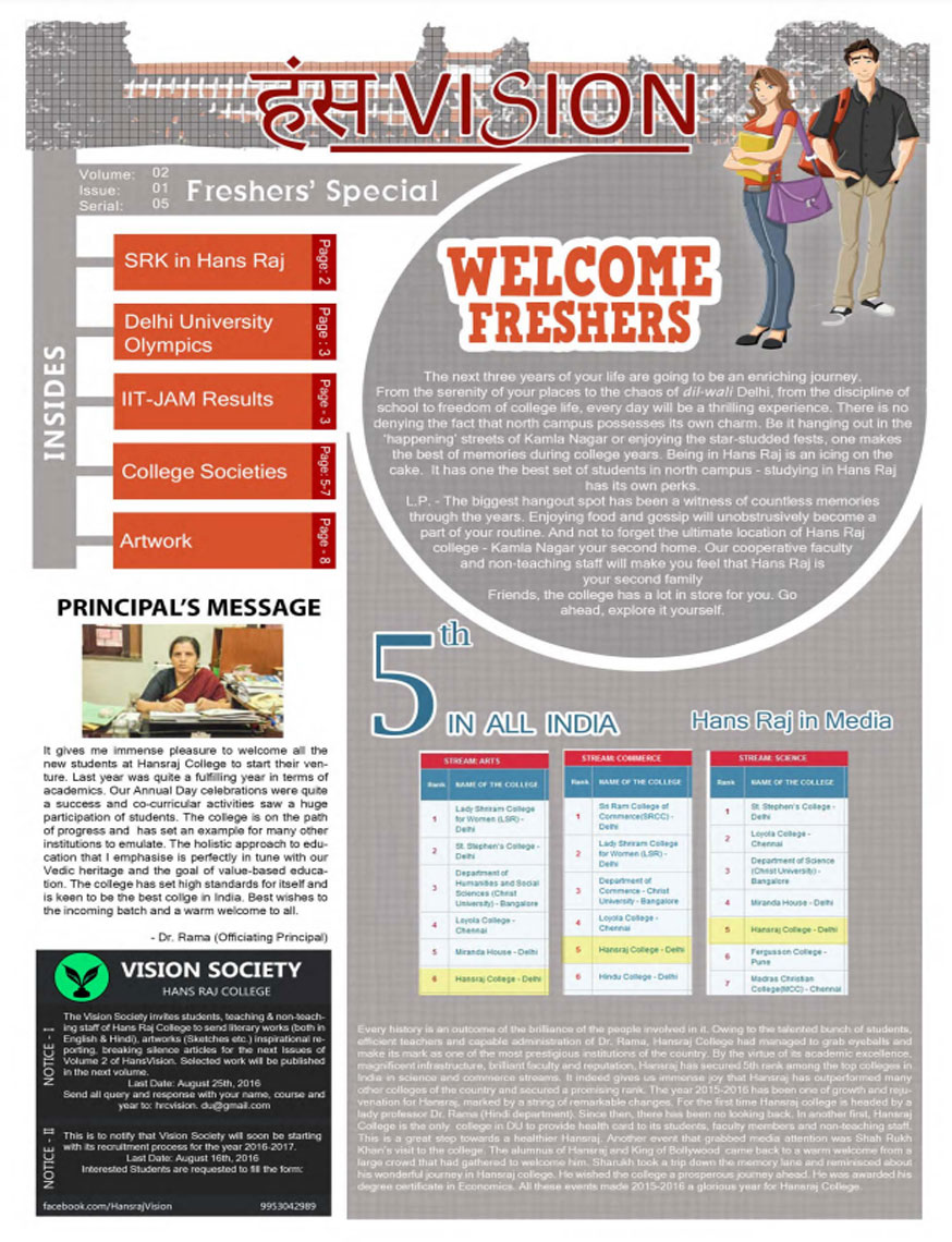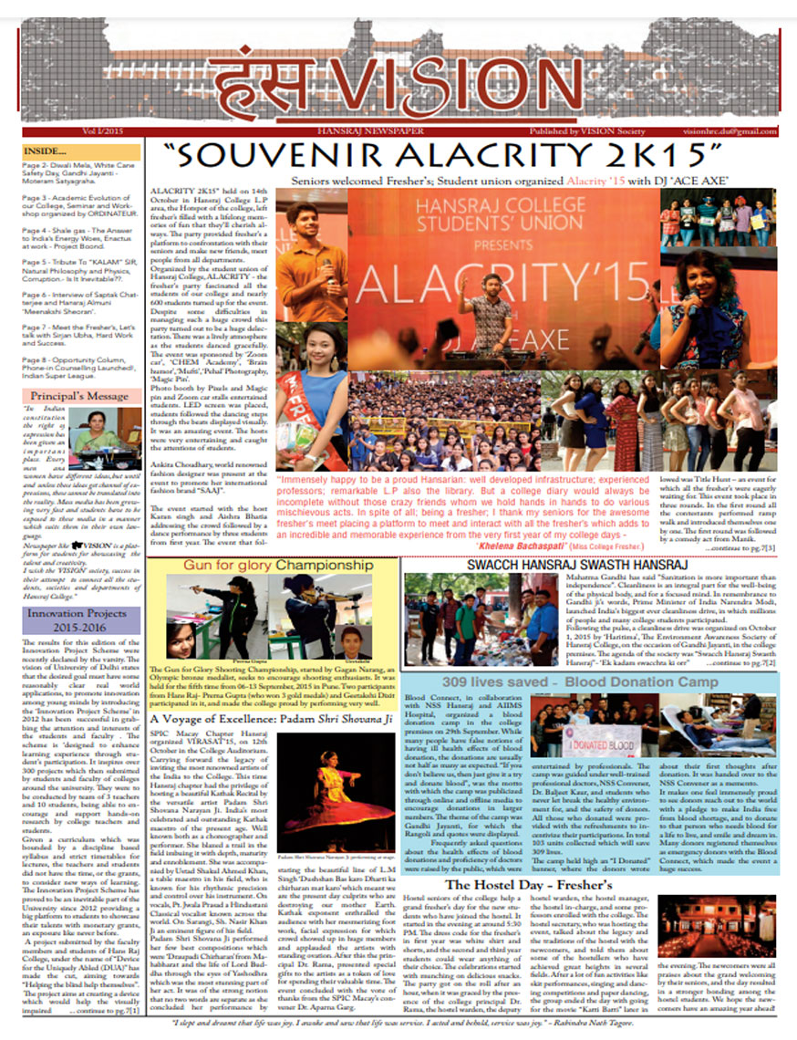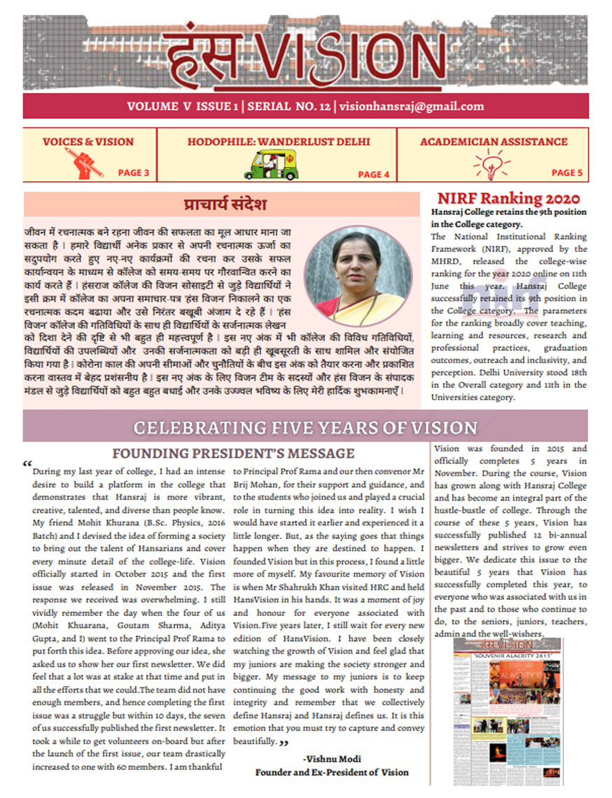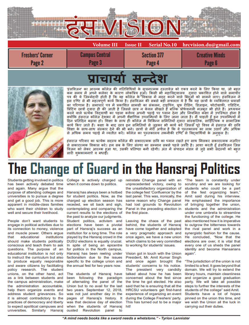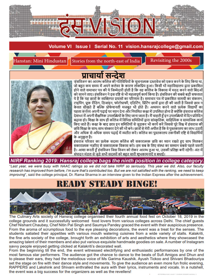 A window into the vibrant life of Hansraj College, HansVision is the bi-annual newsletter of HRC, that aims to connect every aspect of the college with the students. It introduces Hansarians to student journalism and provides them with a platform to voice their opinions. Published by Vision, the Media and Publications Society of Hansraj, it is an amalgamation of the talents that Hansarians have to offer and presents their take on topics of relevance.