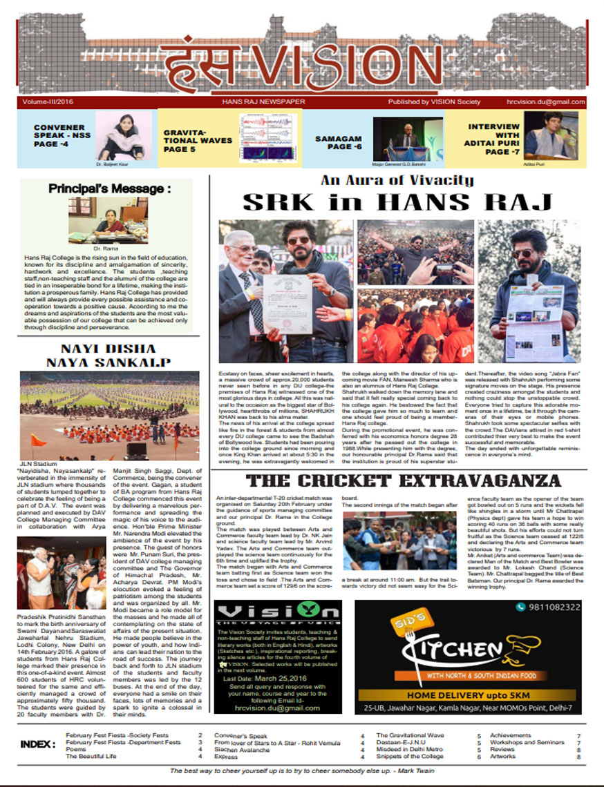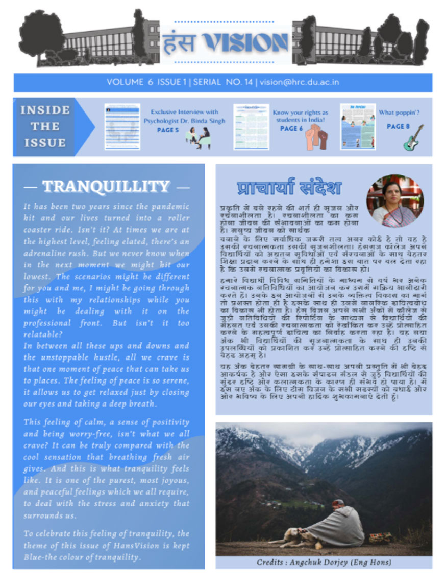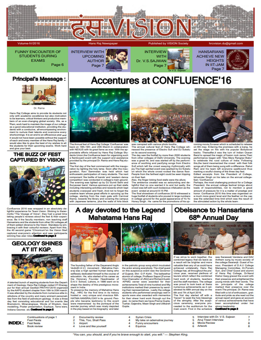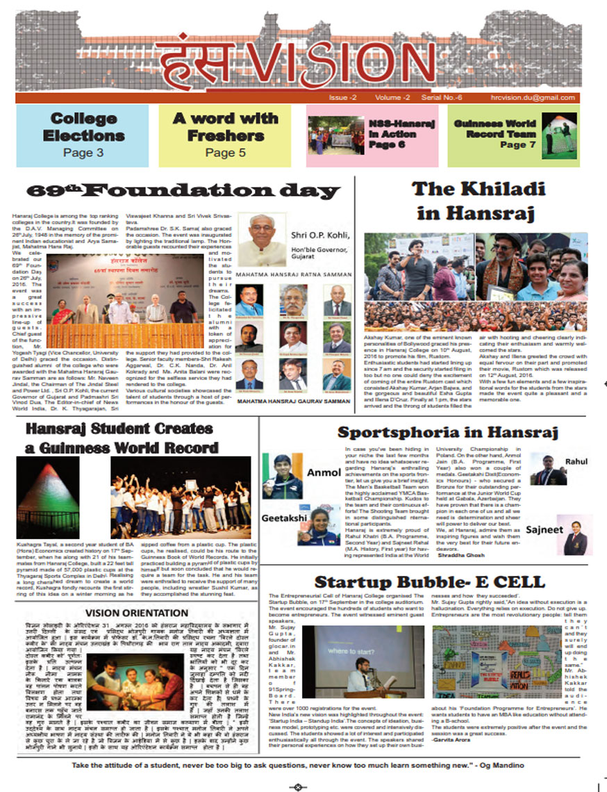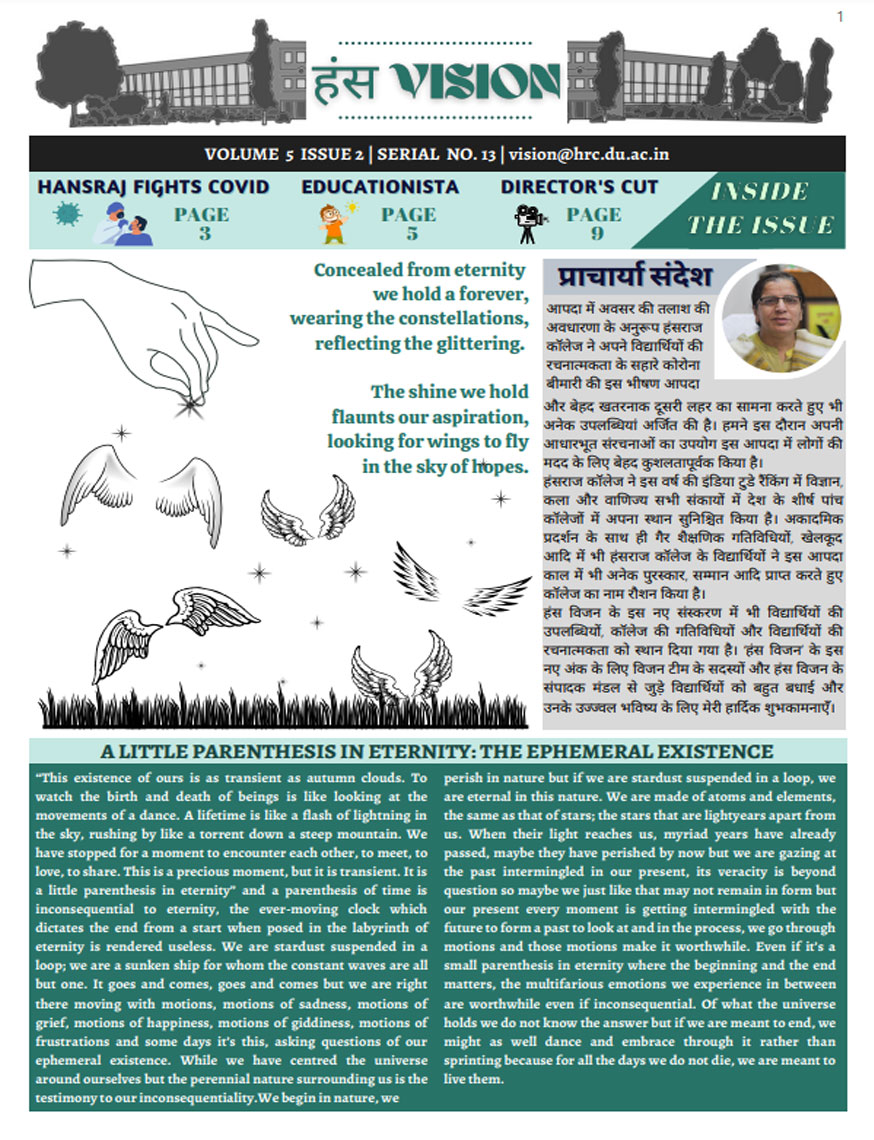 A window into the vibrant life of Hansraj College, HansVision is the bi-annual newsletter of HRC, that aims to connect every aspect of the college with the students. It introduces Hansarians to student journalism and provides them with a platform to voice their opinions. Published by Vision, the Media and Publications Society of Hansraj, it is an amalgamation of the talents that Hansarians have to offer and presents their take on topics of relevance.
