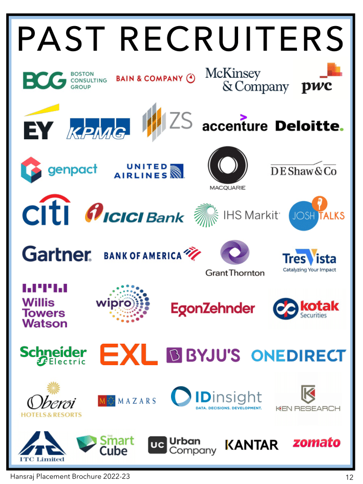 Among the top recruiters of the college are eminent and distinguished organisations like Bain & Co., Kearney, LEK Consulting, Accenture Strategy, ZS Associates, United Airlines, DE Shaw, Deloitte, EY, KPMG, PwC and has attracted recruiters operating in varied industries like Consulting, Investment Banking, Finance, FMCG, Pharmaceuticals, etc.