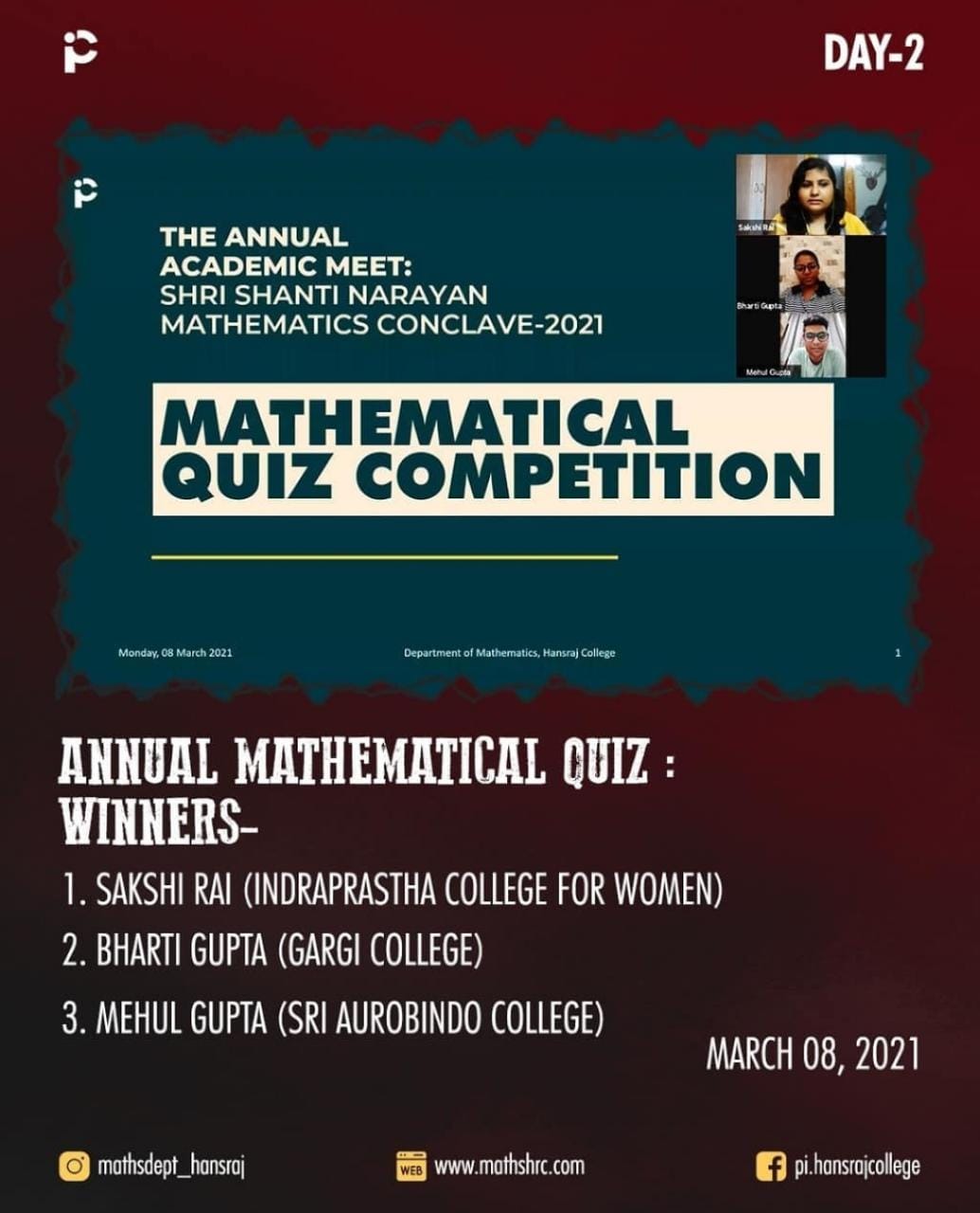 NAAC Grade A++ with CGPA 3.71 NIRF Rank # 3 (Amongst Colleges)Pi: Department of Mathematics, Hansraj College, one of the most prestigious departments of the Delhi University, is a quintessence of the most amazing minds forming a family. With its foundations laid by very fine mathematicians such as Prof. Shanti Narayan, Prof. M.C. Puri, Prof. S. C. Arora, and Dr. S. R. Arora, Dr. Harbans Lal, Dr. K. L. Bhatla, Dr. N.M. Kapoor, Dr. Satpal, and Sh. J. P. Pruthi as guiding lights, the department has always strived to nurture and create global leaders and has made a name for itself for its academic excellence. The department aspires that its students get the most out of their time studying at college through classroom teaching combined with co-curricular experiences.
