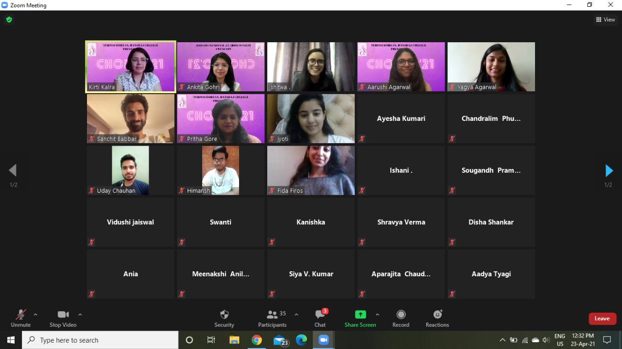 Choreo’21 was one of its kind virtual dance events organized by team Terpsichorean. Mr. Sanchit Babbar and Ms. Jyoti Soni graced the event as the esteemed judge for CHOREO’21. We witnessed a huge response this year with over 100 participants from various societies, teams, and individuals all over the country. Our solo dance competitions, a new venture by the batch of 2021, was widely received by a lot of young artists. Our one-day online fest brought together a lot of artists who were excited to showcase their skills, albeit on an online platform. skills, albeit on an online platform.