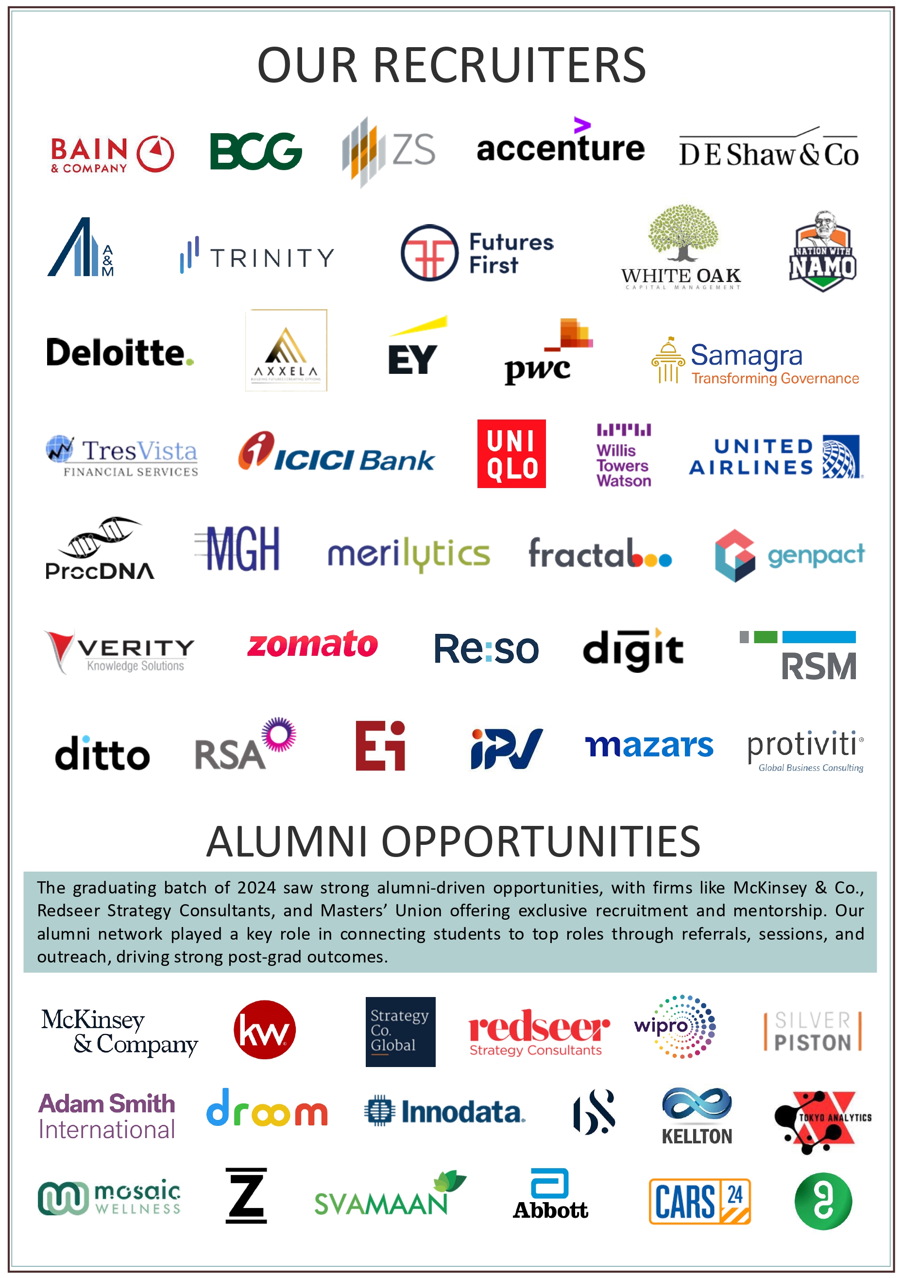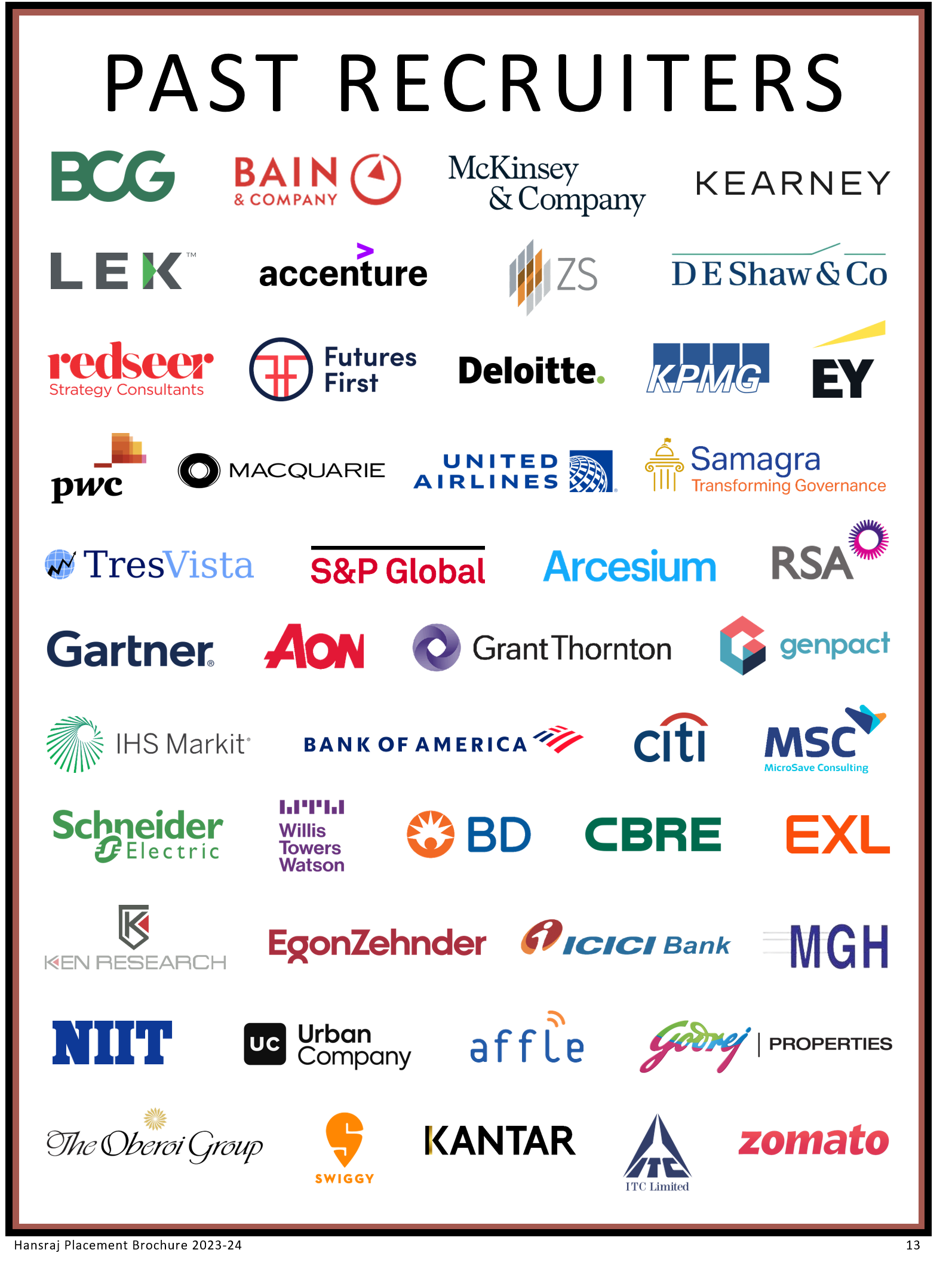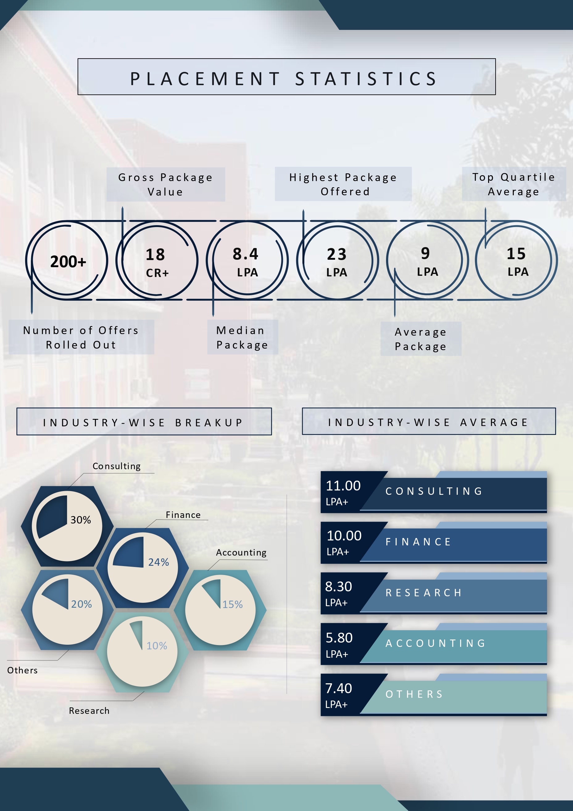 The college has been a host to prominent recruiters like McKinsey & Co., Bain & Co., Boston Consulting Group, Accenture Strategy, ZS Associates United Airlines, DE Shaw, Deloitte, EY, KPMG, PwC and has attracted recruiters operating in varied industries like Consulting, Investment Banking, Finance, FMCG, Pharmaceuticals, etc.