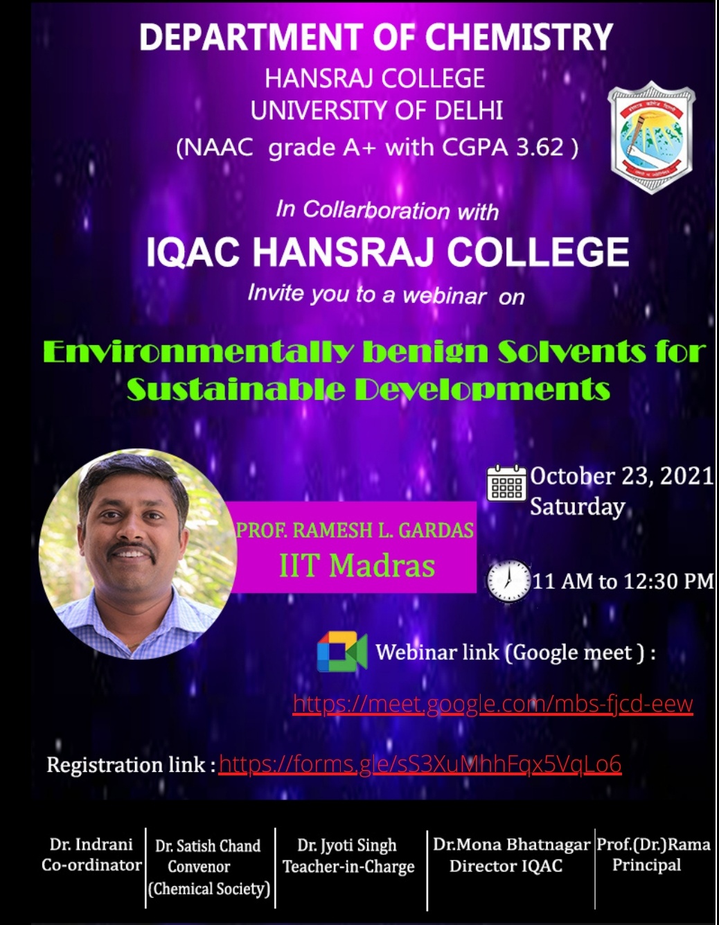 We are elated to share the end of the year report of Rasayanatva, The Chemical Society of Hansraj College highlighting the journey and the accomplishments in the past year. Rasayanatva commenced the session 2020-21 with renewed vigor and a new wave of excitement. As the coronavirus pandemic plunged everyone into despair and locked at homes, the pressure of not letting virtual interaction a barrier in the functioning of the society developed and hence it became requisite for the core- team to switch gears and expand its horizons in terms of creativity and hard work. Regular webinars such as ‘How to cope with mental health during COVID-19 pandemic’, ‘Guide to career opportunities in Chemistry’ etc. featuring esteemed speakers were conducted to help students maximize their knowledge and explore the more interesting sides of Chemistry. The Journal of Rasayanatva is one of the most noteworthy achievements in the previous year. The journal encapsulates review articles on the researches performed by the scientists from the wide spectrum of Chemistry. Instagram series ‘Factophile’ representing a blend of learning and fun through thought-provoking posts is another initiative taken mainly to increase the social media outreach. To impart wisdom and scale the scientific interests in students we organized a national conference on ‘New frontiers in Biosensing’ where renowned guest speakers from the field of Chemistry addressed the forum. The Chemical Society bid farewell to the students of the batch of 2021 in the month of May and wished them luck for future. We also released the seventh edition of our annual magazine called ‘Equilibrium’ this year. The session 2020-21 brought many unprecedented challenges but the overwhelming participation we received in our every endeavor inspired us to not settle.